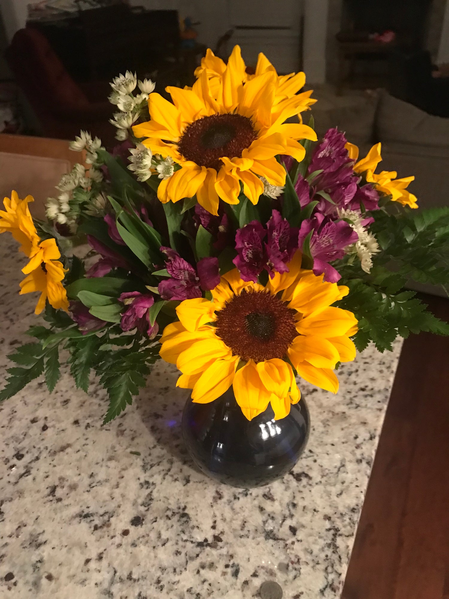 Featuring a variety of seasonal flowers with greenery arranged in a medium vase.